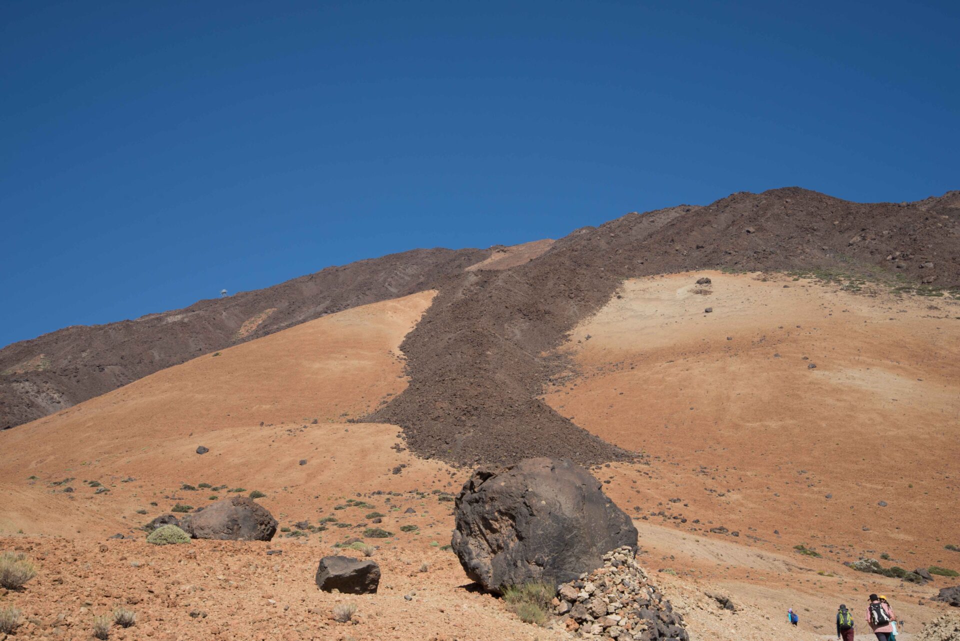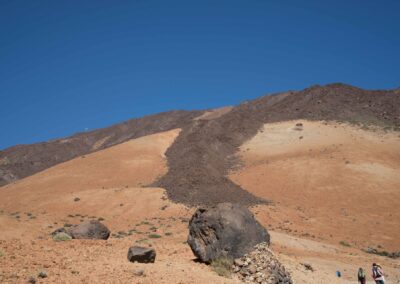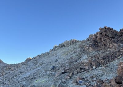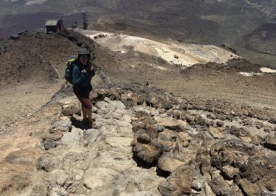 Comenzaremos el ascenso a 2348 metros de altitud, adentrándonos en un paisaje característico del volcanismo explosivo, un manto de piedra pómez. Después, nos internaremos en la zona más desafiante, entre brazos de lavas negras, donde la pendiente puede superar el 60% en algunos tramos. Continuaremos atravesando el malpaís del Teide y nos enfrentaremos al último ascenso al cráter.